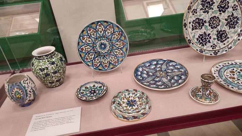 Ξεναγηθήκαμε από τον επιμελητή της έκθεσης ιστορικό κ Σταθακόπουλο, ο οποίος με εξαιρετικά γλαφυρό και λεπτομερή τρόπο μας έφερε σε επαφή με τα υπέροχα κεραμικά δημιουργήματα των προσφύγων κεραμιστών από την Κιουτάχεια της Μικράς Ασίας. Οι πρόσφυγες αυτοί αγγειοπλάστες που μετά την Μικρασιατική καταστροφή εγκαταστάθηκαν στο Νέο Φάληρο, δημιούργησαν μια βιοτεχνία, η καλλιτεχνική παραγωγή της οποίας, κατά τη διάρκεια της πενηντάχρονης σχεδόν πορείας της, απέφερε πλούσιους καρπούς. Κατασκευάστηκε ευρεία ποικιλία διακοσμητικών αντικειμένων, όπως πινάκια, ανθοδοχεία επιτραπέζια και επιτοίχια, σταχτοδοχεία , κηροπήγια, μπωλ, αγγεία, κανάτες, φλυτζάνια κλπ, αντιπροσωπευτικά δείγματα των οποίων είχαμε την δυνατότητα να θαυμάσουμε στην υπέροχα “στημένη” έκθεση.