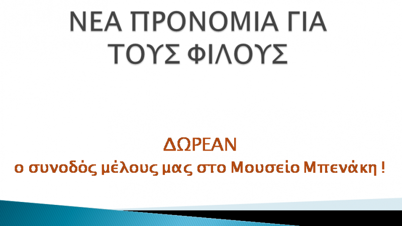 Μπορείτε πλέον, να απολαμβάνετε ελεύθερη είσοδο, εσείς και ένας συνοδός μη μέλος, στις μόνιμες συλλογές και τις περιοδικές εκθέσεις στο Μουσείο Μπενάκη και τα Παραρτήματά του.